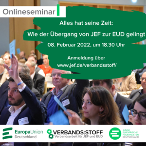 Wenn die „Bioklippe“ näher rückt und man sich auf JEF Veranstaltungen alt fühlt, dann, ja dann, ist es Zeit sich in der EUD zu engagieren. Oft ist der Übergang nicht so einfach, unterschiedliche Erwartungen und Vorstellungen von Engagement „prallen“ aufeinander. JEF und EUD sind gleichermaßen gefragt Mitgliedern den „Wechsel“ von JEF zur EUD zu erleichtern. Wie der Übergang gelingen kann und was Aktive von JEF und EUD dabei beachten sollten, damit befassen wir uns bei der ersten JEF-EUD online Akademie im Jahr 2022! Gute Beispiele gibt es viele in den Verbänden. Wir tauschen uns mit Euch und den beiden ehemaligen stellv. JEF-Bundesvorsitzenden, Katharina Borngässer (Co-Landesvorsitzende der Europa-Union Berlin) und Linda Bottin (Mitglied des EUD-Präsidiums), über Erfahrungen, Erkenntnisse und gute Beispiele aus.