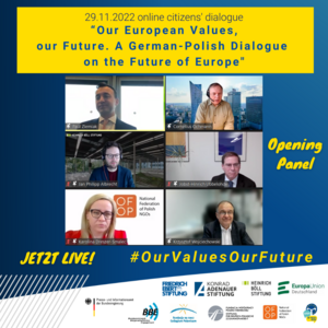 Debattieren Sie in Breakout Sessions und folgen Sie Impulsvorträgen von hochkarätigen Mitwirkenden wie Klara Geywitz, Bundesministerin für Wohnen, Stadtentwicklung und Bauwesen der Bundesrepublik Deutschland, bei unserem digitalen deutsch-polnischen Zukunftsdialog „Our European values, our future. A German-Polish dialogue on the future of Europe“ am 29. November 2022 von 9:00 bis 17:00 Uhr.