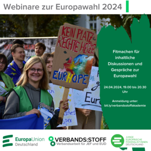 Jetzt geht es in die heiße Phase vor der Europawahl. Bei unserer digitalen verbands:stoff-Akademie am 24. April um 19 Uhr machen wir uns fit für die inhaltlichen Diskussionen und Gespräche bei Aktionen, Infoständen und Veranstaltungen. Nachdem wir uns bei einem Webinar mit der Gesprächsführung an sich befasst haben, geht es jetzt um Fakten und inhaltliche Argumente, die für die EU sprechen. Dabei wollen wir einen besonderen Blick auf die Themenkomplexe Klima und Energie, Asyl und Migration, Wirtschaft und Währung sowie Bürokratie…