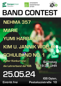 Der Kreisverband Verden der Europa-Union Deutschland veranstaltet am Samstag, den 25. Mai 2025 im Rahmen seiner Europawahlkampagne einen Bandcontest für junge Musiker*innen aus dem Landkreis Verden. Der Contest startet um 19:30 Uhr in der IGS in Oyten, Pestalozzistraße 10, 28876 Oyten. Der Eintritt ist frei.